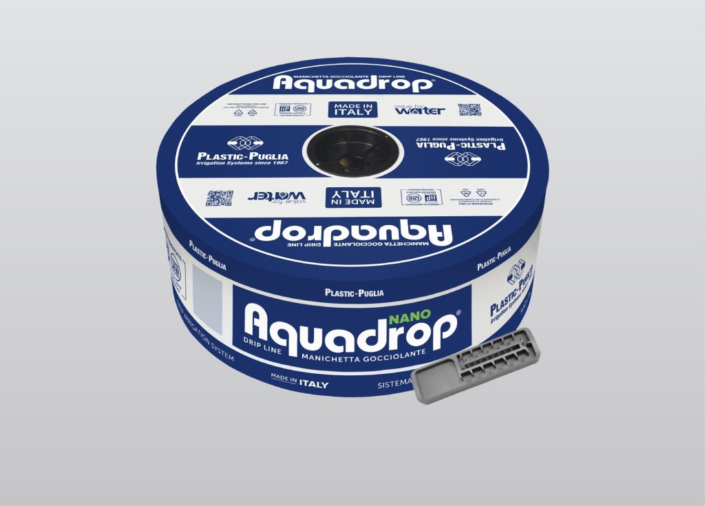 La cinta de goteo estándar AQUADROP NANO está fabricada en polietileno negro y cuenta con un gotero plano ultra compacto, ideal para espacios reducidos y largas distancias. El laberinto está diseñado para crear un flujo turbulento, evitando la formación y acumulación de depósitos que causan obstrucciones. El pequeño tamaño del gotero Nano y su diseño con bordes curvos garantizan un factor KD muy bajo, lo que se traduce en una reducida pérdida de presión de agua dentro del gotero.